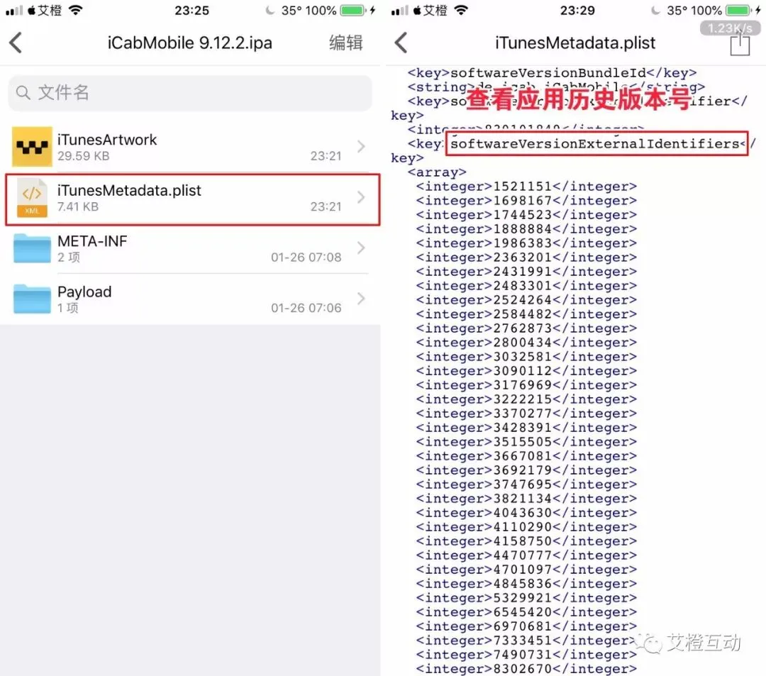 在iTunesMetadata.plist 文件,我们可以查看购买记录等信息,其中 Software Version External Identiers 一栏,可以看到该软件的历史版本号。