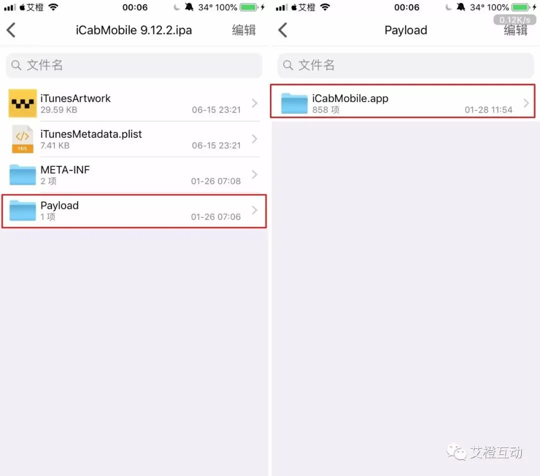 如下图示例为iCabMobile,在ipa 包内容中打开iCabMobile.app这个文件夹。