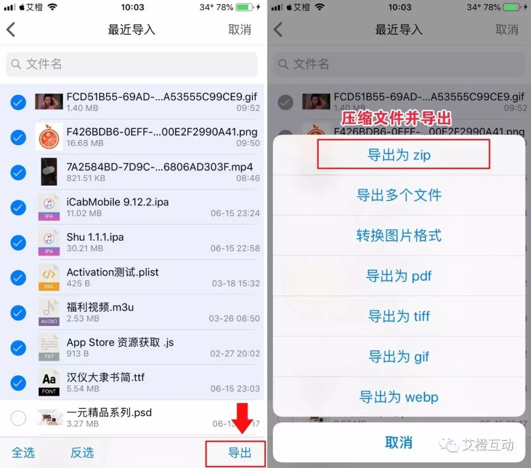 Shu 支持文件压缩,使用起来非常简单。选择文件后,点击导出,就可以将文件压缩为zip 格式并分享导出。
