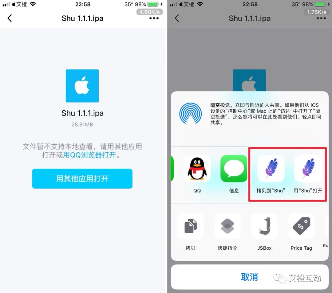 将文件导入Shu 非常简单,例如QQ中收到一个压缩包,我们选择“用其他应用打开”,分享菜单选择用Shu 打开,即可导入Shu。其中