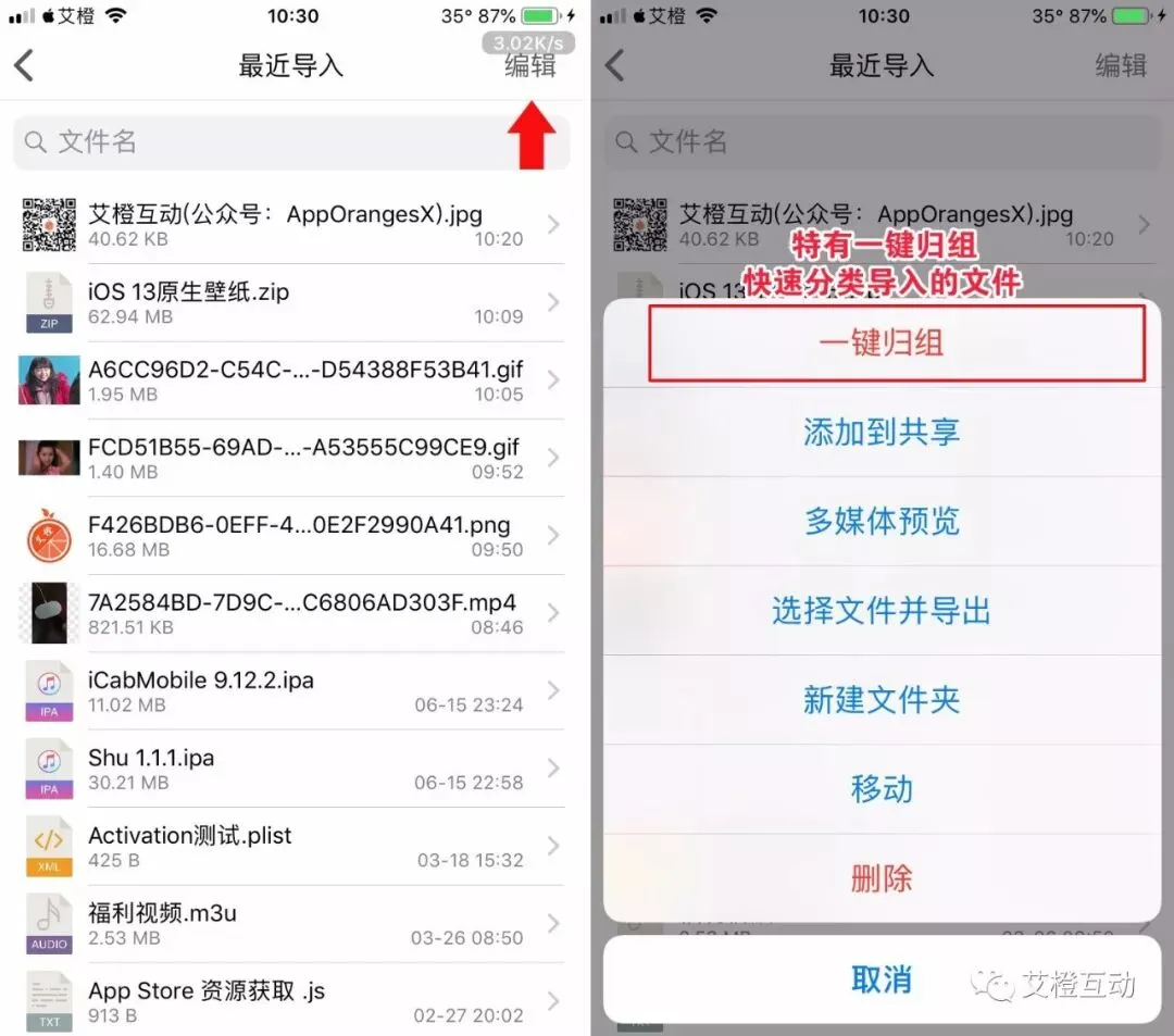 我们可以点击右上角“编辑”,对文件进行管理。Shu 特有“一键归组”功能,一键将常见文件按类型分组到相应的内建目录中。