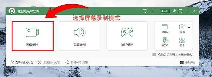 第1步:运行数据蛙录屏软件,依据实际使用需求选定录制模式,本教程将以最基础的“屏幕录制”模式为操作示例;
