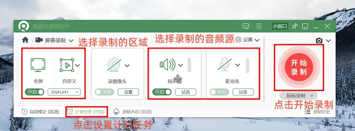 第2步:录制启动前,软件会引导你完成录制范围与音频的设置,基础配置结束后,若有特殊要求,可点击下方【计划任务按钮】进行更详细的参数调整;