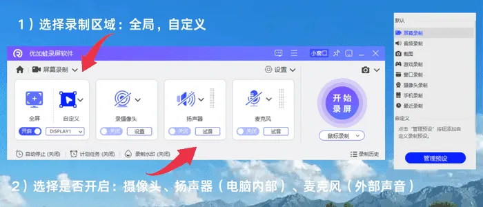 优加蛙录屏软件提供多种录制模式,包括全屏、自定义区域、窗口、游戏、音频和摄像头画中画。使用画中画模式时,教师能同时录制课件和摄像头画面,配合箭头、文本或形状等标注工具,有效提升微课教学质量。对于游戏玩家,该软件支持高清录制,确保声画同步,便于分享精彩瞬间。会议场景中,预设录制时间功能可自动启动,避免错过重要内容。