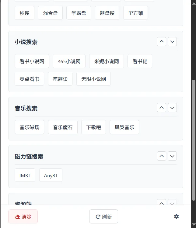 这是一个浏览器的扩展插件,作用就是内置各种网盘,资源站点一键搜索资源,主打的就是一个方便。安装后就可以看到内置的有网盘,ci力,小说,音乐下载等,可谓丰富至极。