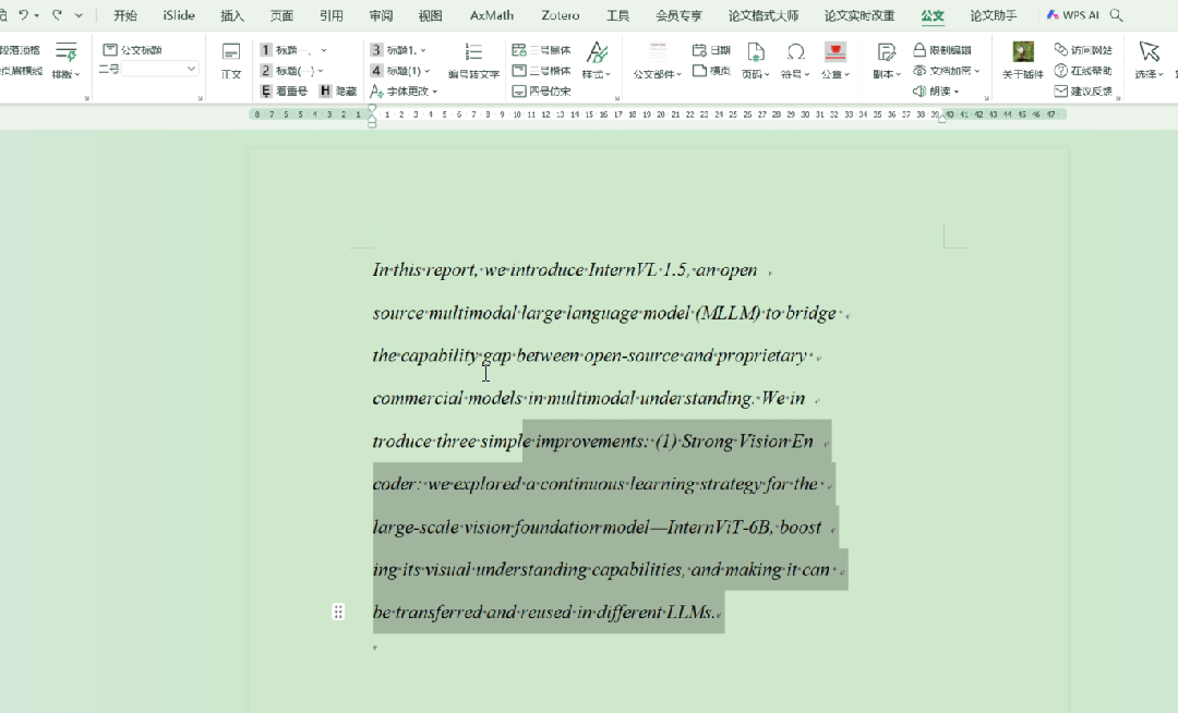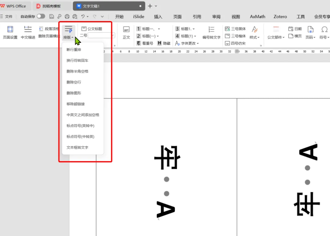 4. 断行重排或删除半角空格。在复制一些PDF论文里的双栏文字到word中后,常会发现都是断行的。此时,选中文字后,在公文插件中“排版”选项卡中选择“断行重排”,即可快速将双栏文字的断行组成单栏文字。如有是需要删除文字中的半角空格或空白,在大面积复制时,可快速调整格式。