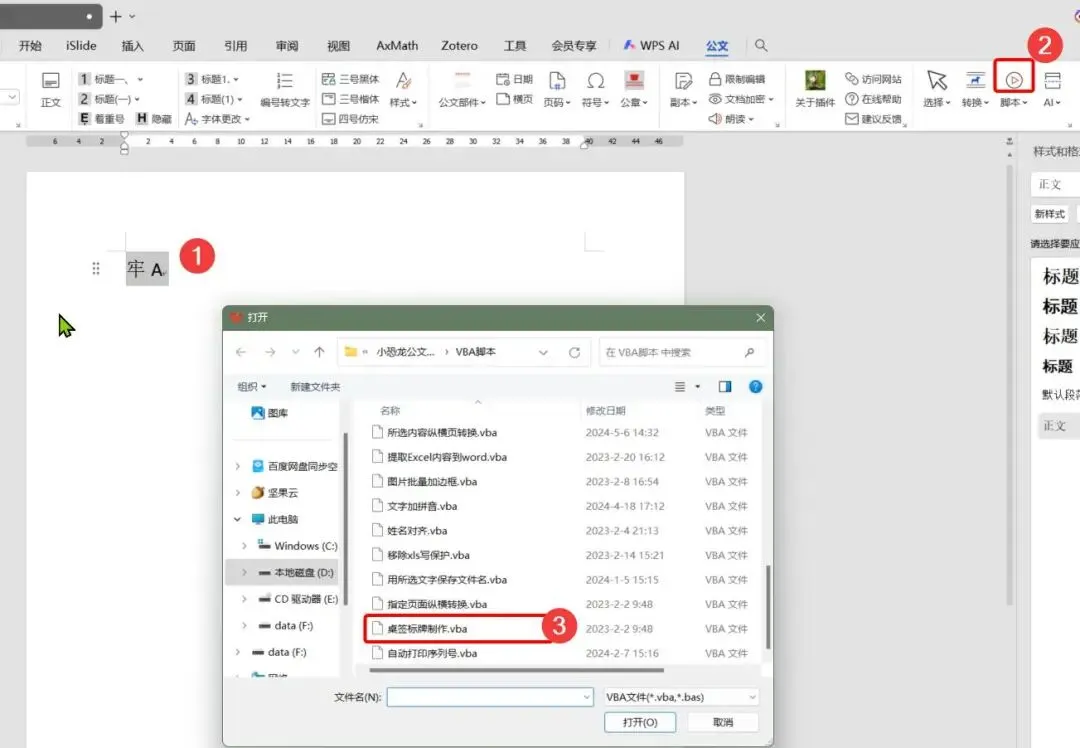 2.在下载的小恐龙公文排版助手的压缩包中有开发者提供的“VBA脚本.zip”,解压后可以通过插件调用。比如:桌签标牌制作,选中名字,点击脚本上的按钮,选择VBA脚本文件夹中的”桌签标牌制作.vba”