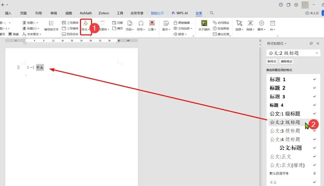 8.公文样式:小恐龙公文助手根据《党政机关公文格式国家标准》(GB/T 9704—2012)进行软件功能设置。公文是其主要特色功能。打开“公文”插件选项卡->“样式”->在左侧就可看到各级公文的字体和大小设置的样式,点击对应的样式即可。