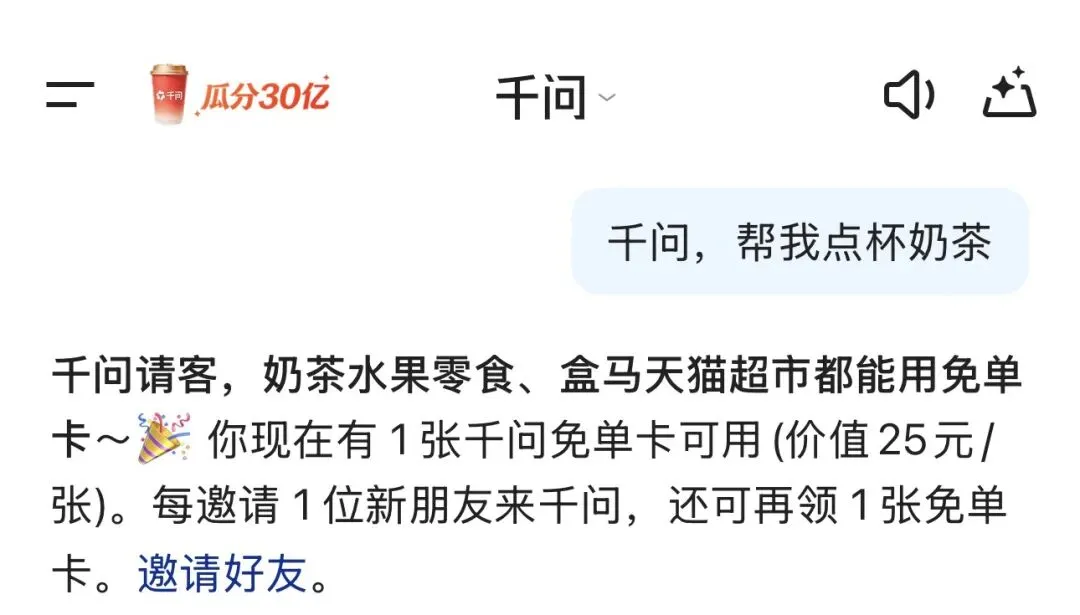 千问开启”春节30亿免单””1分钱喝奶茶”活动火爆!全网薅羊毛!9小时1000万单 AI累垮:求放过!明天再来免单卡使用期限至2月23日