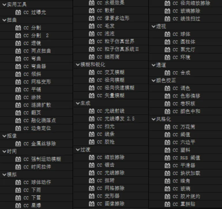 而汉化安装后,多种分类效果一目了然,包括了实用工具、扭曲、抠像、时间、模拟、模糊和锐化、生成、过渡、透视、通道、颜色矫正、风格化!