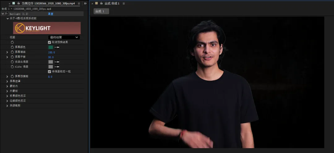 就在效果和预设的抠像中可以找到 Keylight,作为最经典的抠像插件,现在使用效果依然不差,很多时候的蓝绿幕抠像还是要用它。