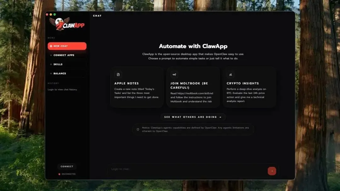 2026年2月6日,在 Product Hunt 日榜排名第 7 的 ClawApp 试图解决这一痛点。它是由 Sahara AI 推出的一款 macOS 桌面应用程序,旨在为 OpenClaw 提供一个开箱即用的图形化界面,让普通用户也能在几分钟内运行本地 AI Agent。