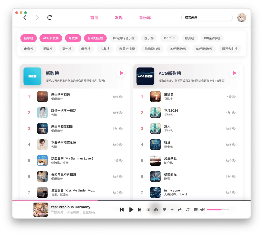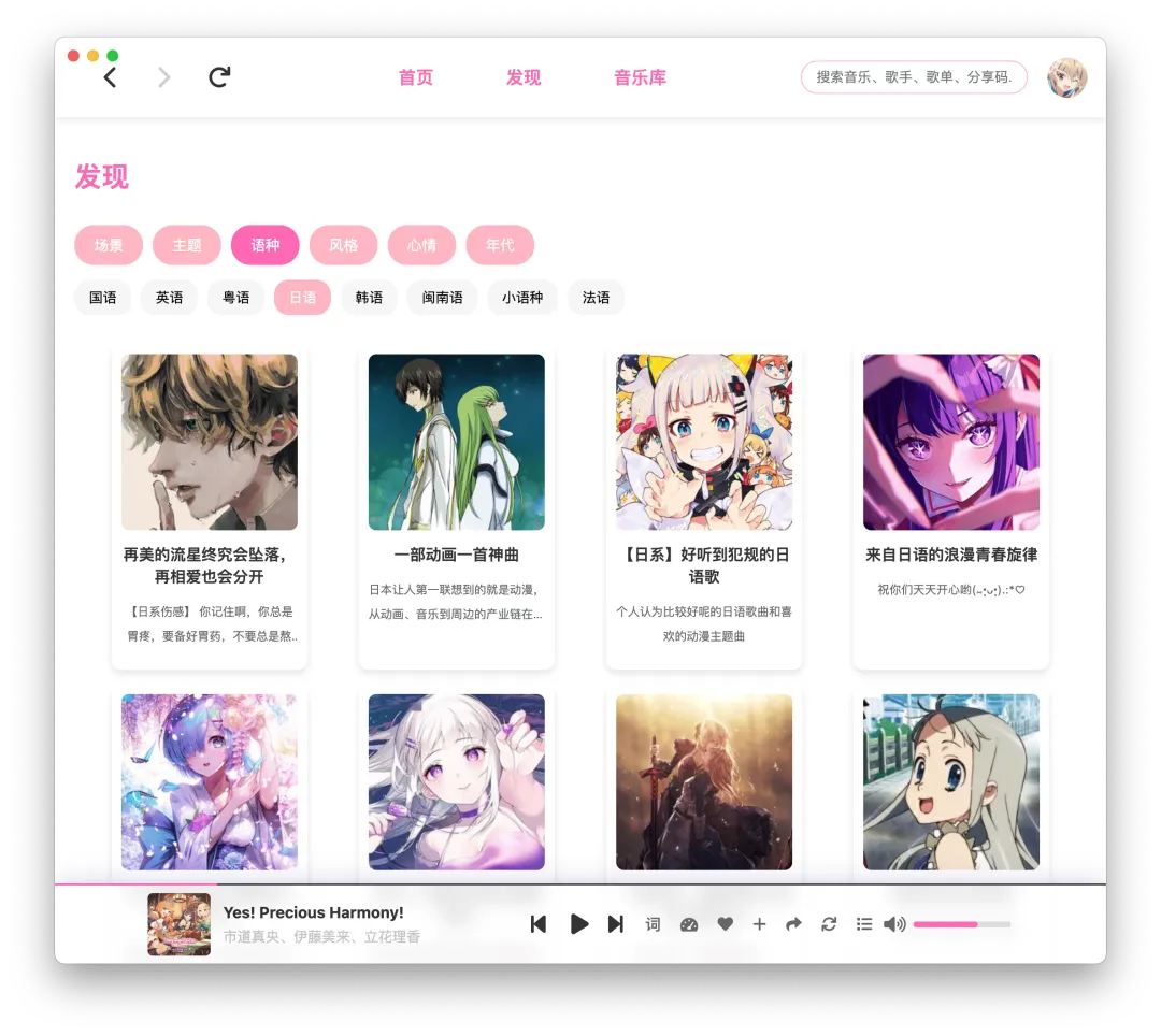 没有直播入口、没有购物弹窗、没有社交冗余功能,打开APP满屏都是音乐相关内容。而且它自带二次元风格UI,还支持主题色自由切换,甚至能自定义启动问候语,比千篇一律的官方界面有个性多了。