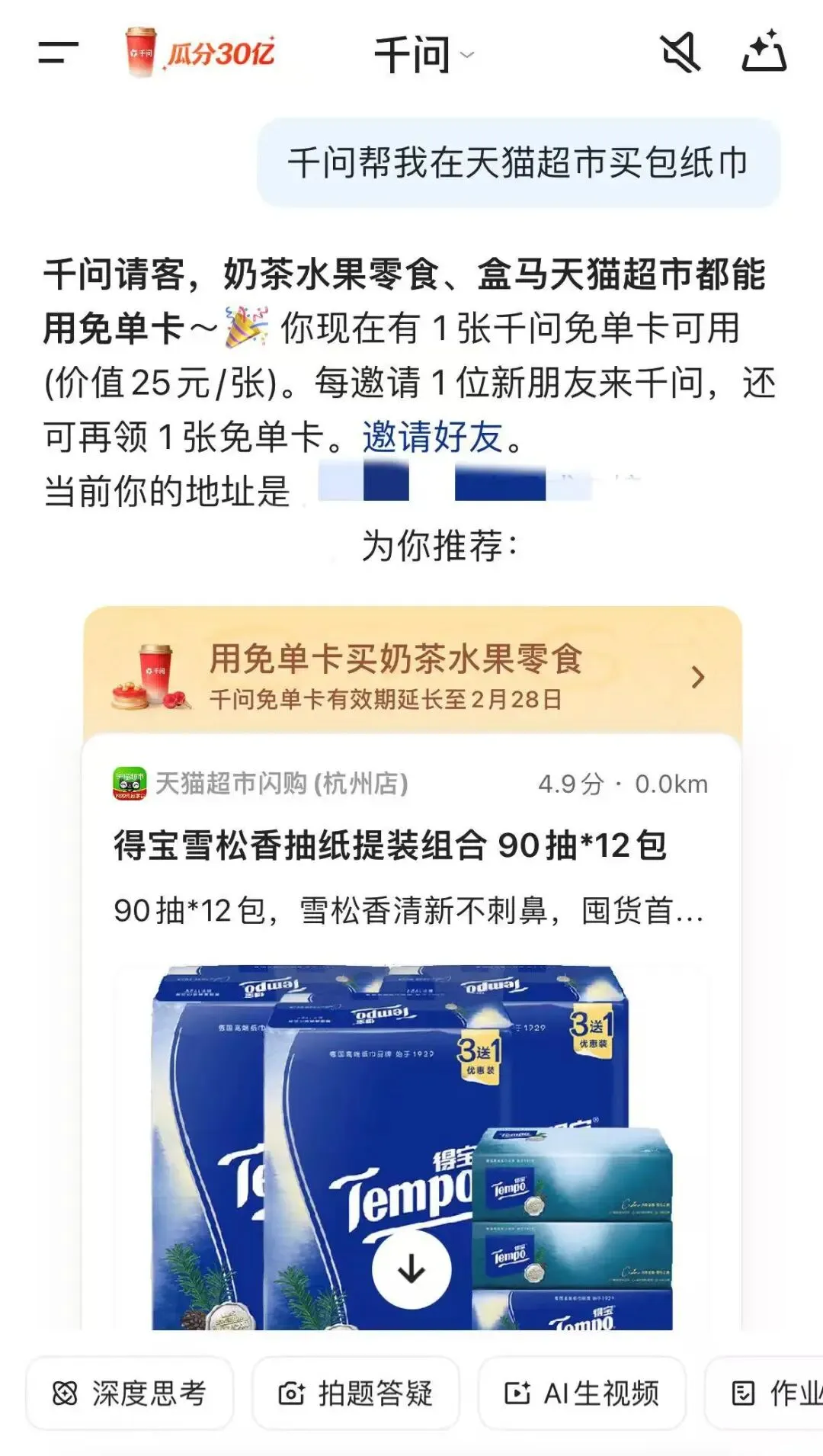 免单卡能买天猫超市了!千问APP实现“一句话购物”