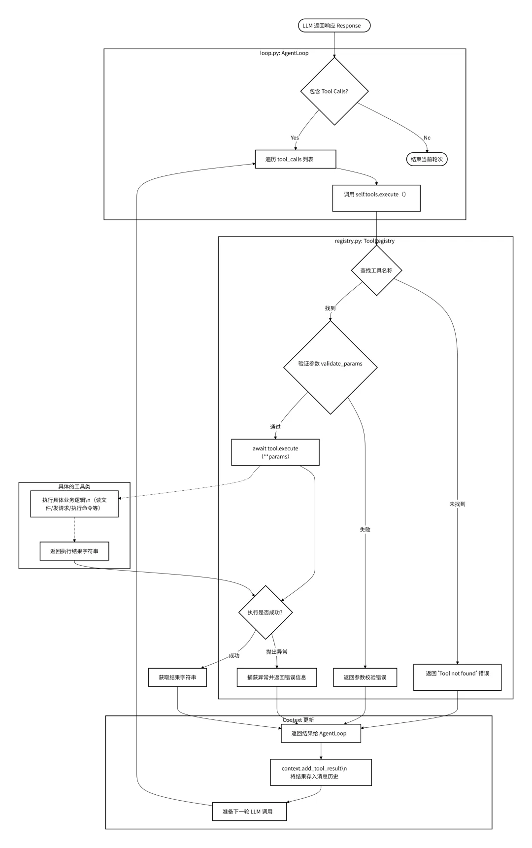 # loop.py L214-220for tool_call in response.tool_calls:# ... (日志记录)# 调用注册表执行工具 result = await self.tools.execute(tool_call.name, tool_call.arguments)# 将结果添加回消息历史 messages = self.context.add_tool_result( messages, tool_call.id, tool_call.name, result )