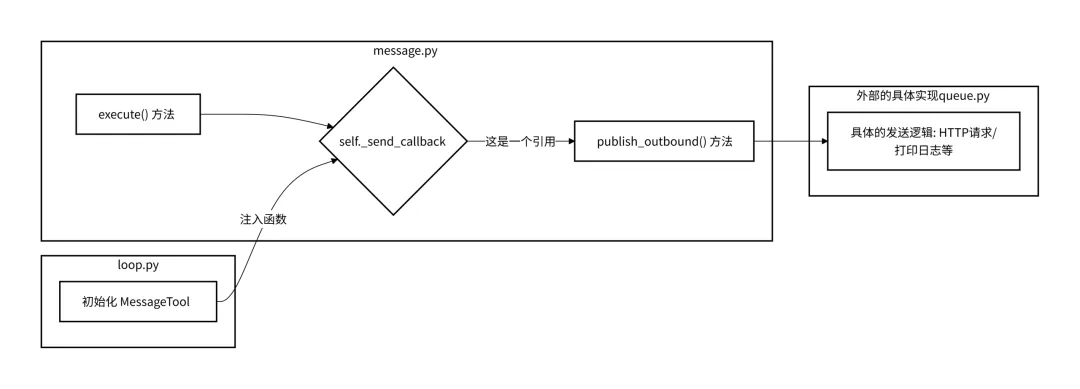 包含工具MessageTool 依赖nanobot.bus.events.OutboundMessage数据结构,通过回调函数self._send_callback(msg)将消息发送出去。 这个回调函数通常连接到系统的消息总线(MessageBus),最终由具体的适配器(如 Telegram Bot API 或 CLI 输出)处理发送逻辑。