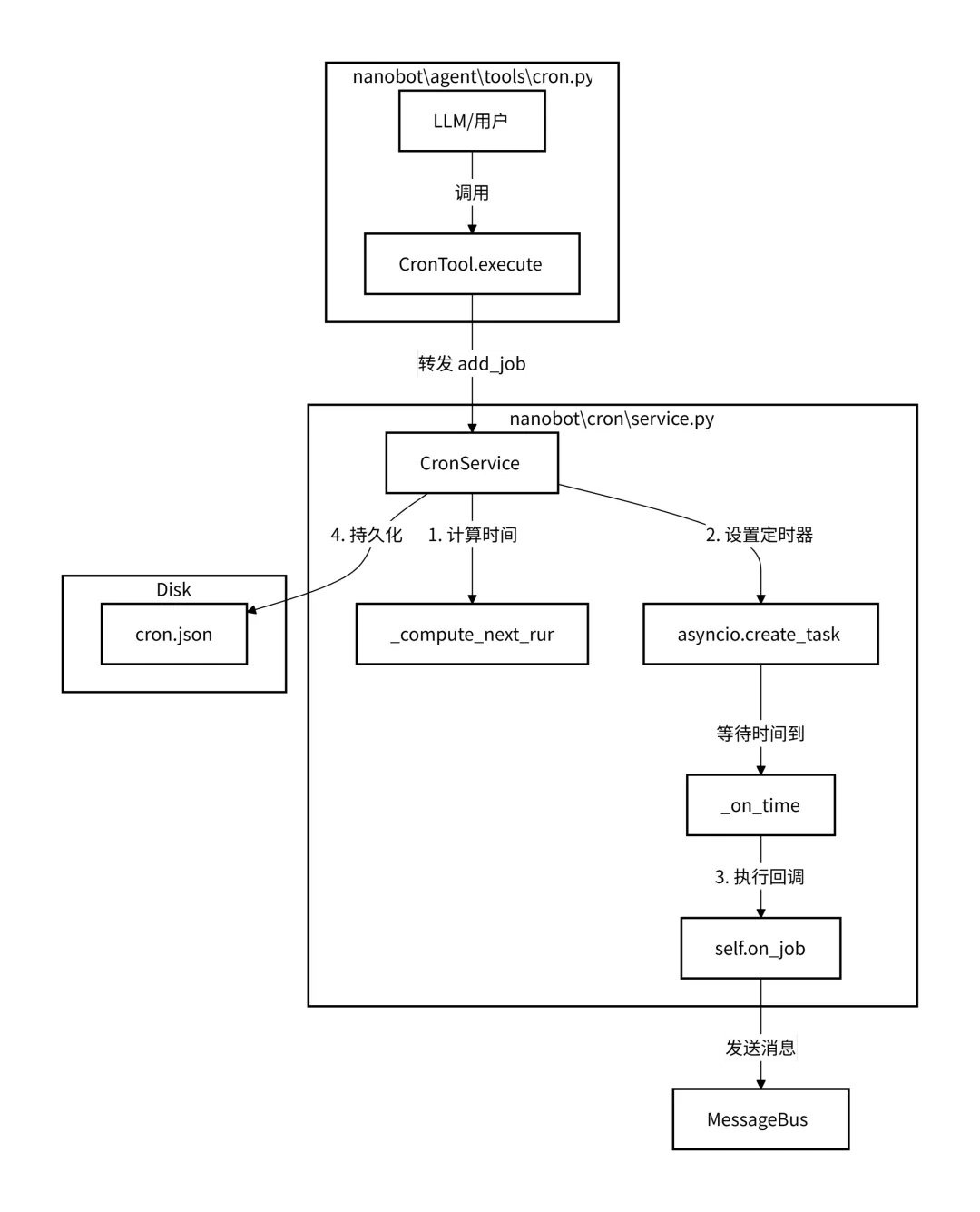 定义了一个名为 CronTool 的工具类,该类赋予了 Agent 安排提醒和重复性任务的能力。它是 Nanobot 任务调度系统与 LLM 之间的桥梁。 这里只有_add_job(添加任务)、_list_jobs(列出任务)和_remove_job(删除任务)的函数,主要是管理任务。而具体的实现在 nanobat/cron/service.py中CronService。