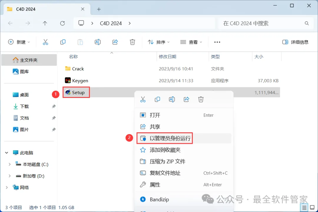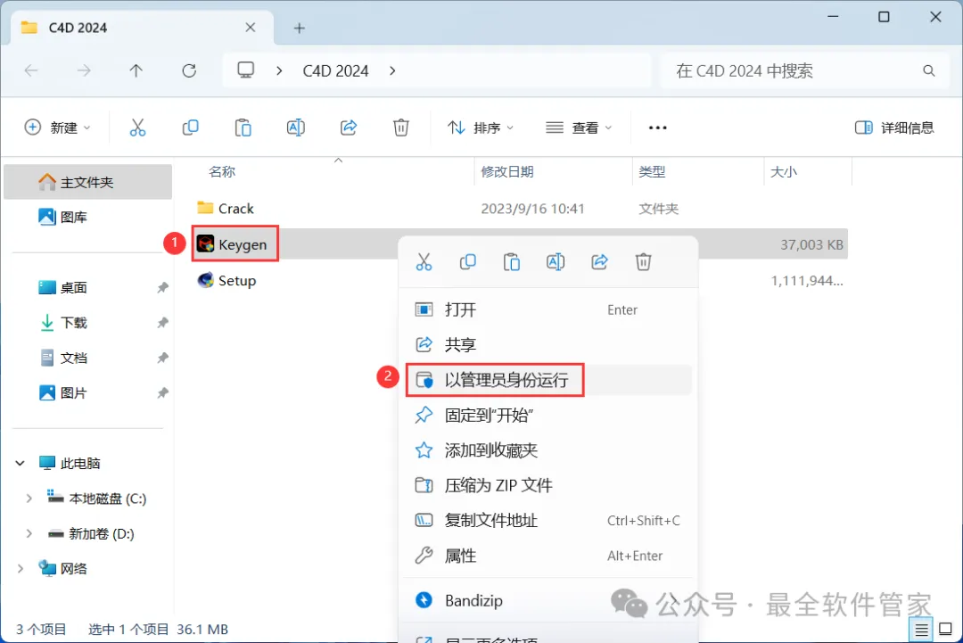 15、回到C4D 2024文件夹,找到【Keygen】程序,右键选择【以管理员身份运行】它