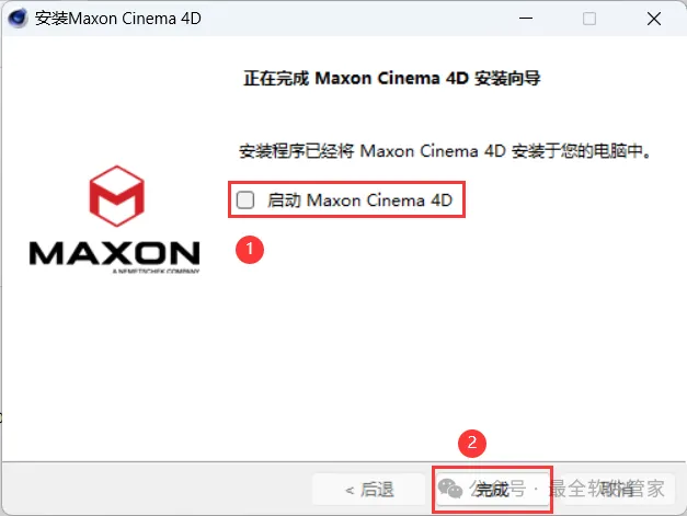 8、不勾选【启动Maxon Cinema 4D】,再点击【完成】