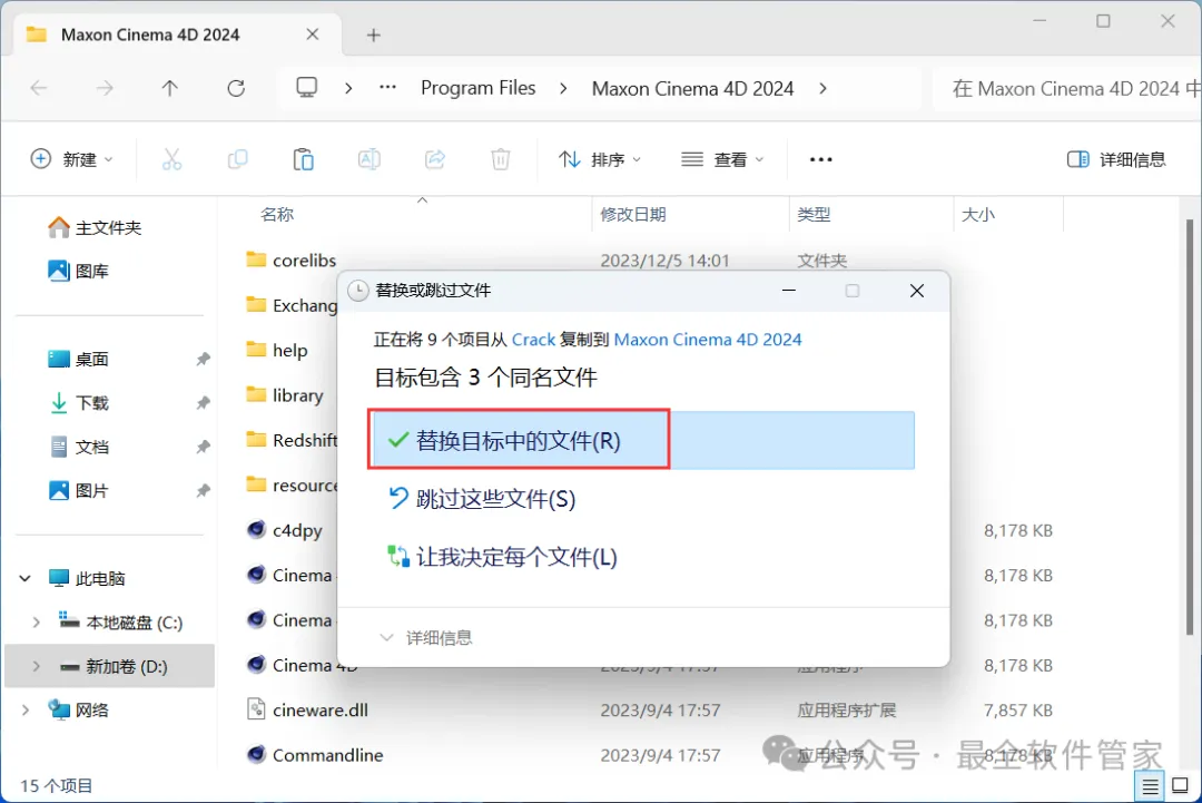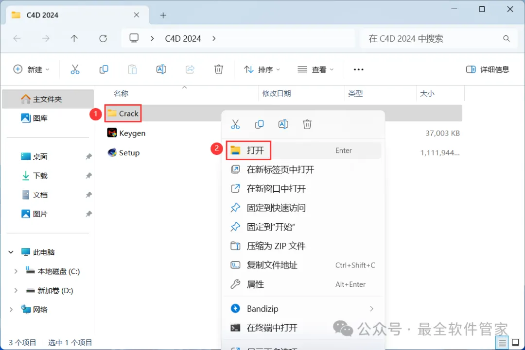 9、回到C4D 2024文件夹,找到【Crack】文件夹,右键【打开】它