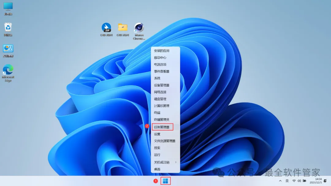 20、回到桌面,右键任务栏的【开始菜单】,点击【任务管理器】