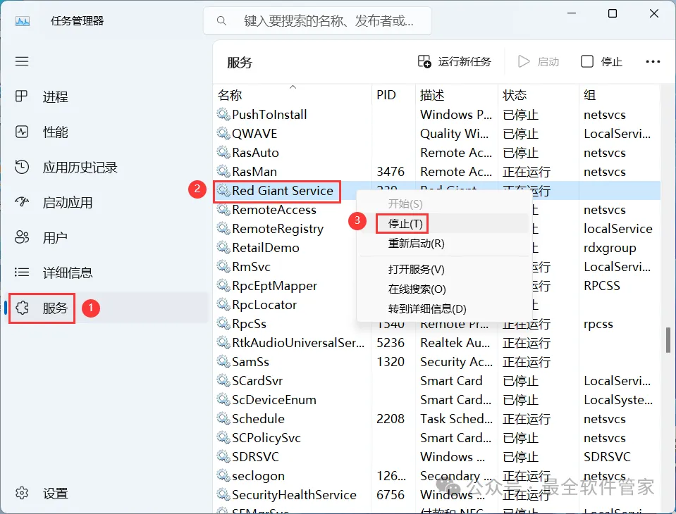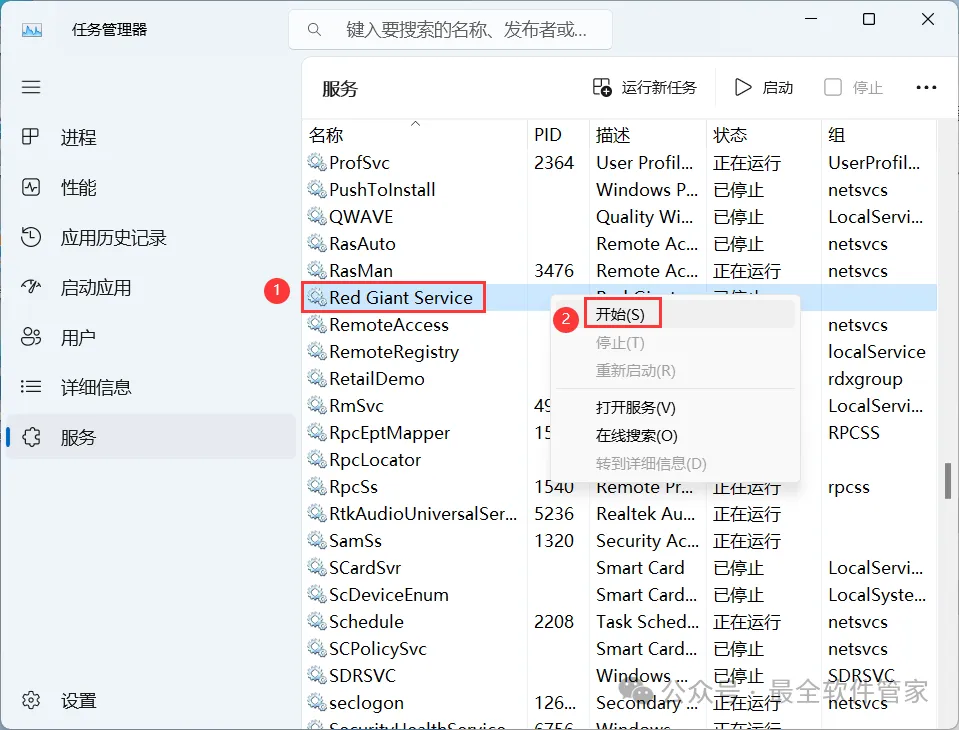 26、回到任务管理器界面,找到【Red Giant Service】,右键它点击【开始】