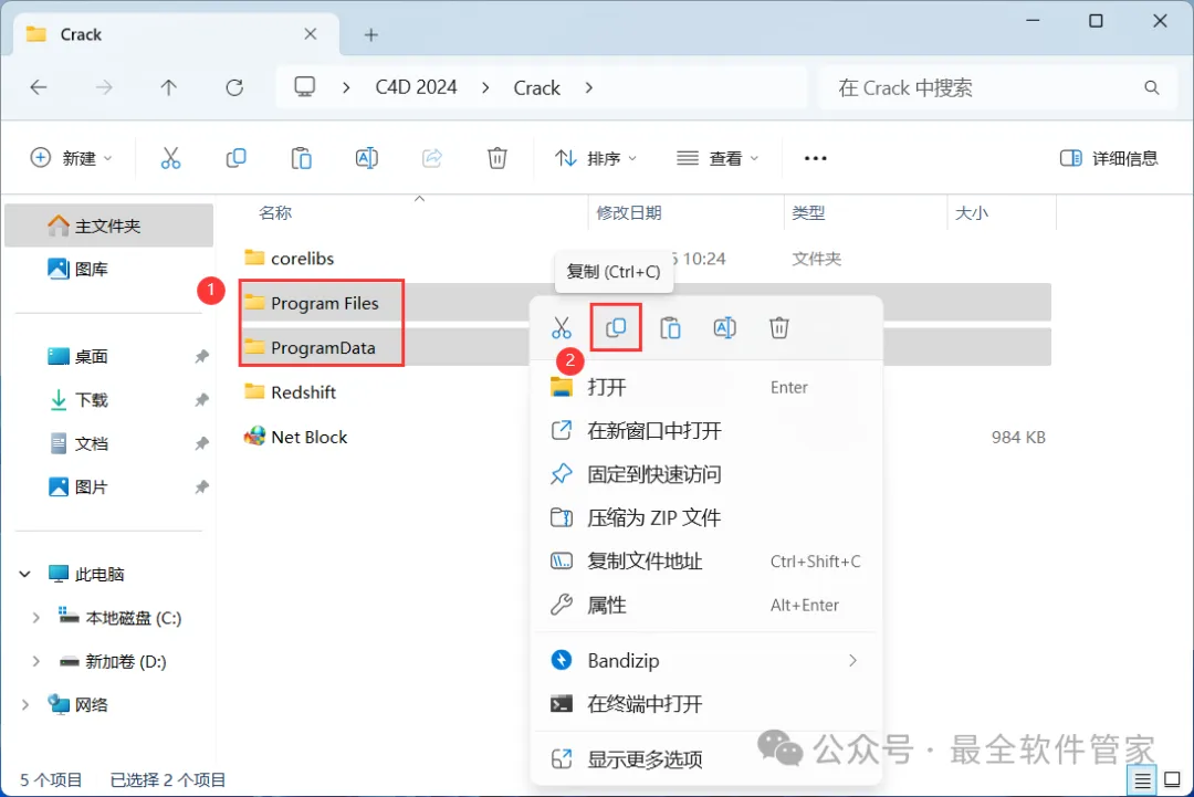 22、回到Crack文件夹,找到并选中【Program Files】和【ProgramData】文件夹,再右键点击【复制按钮】