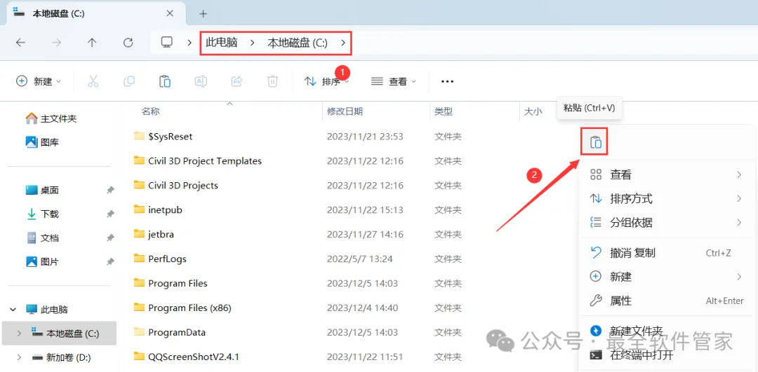 23、打开本地C盘,再右键文件夹的空白处,点击【粘贴按钮】