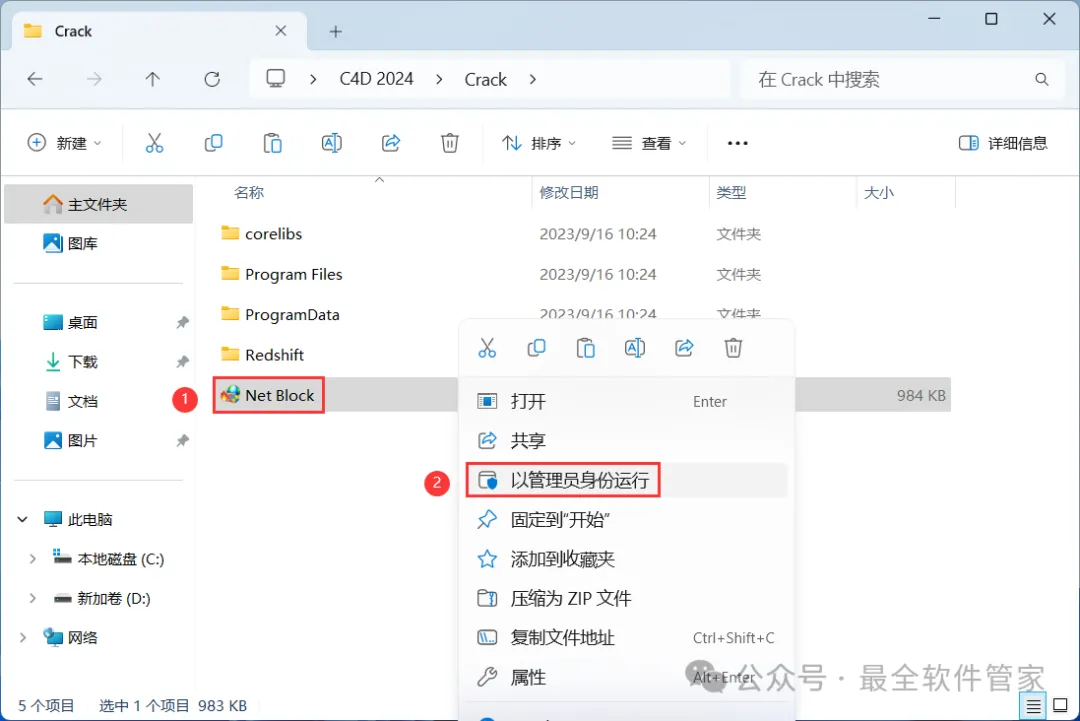 27、回到Crack文件夹,找到【Net Block】程序,右键选择【以管理员身份运行】它