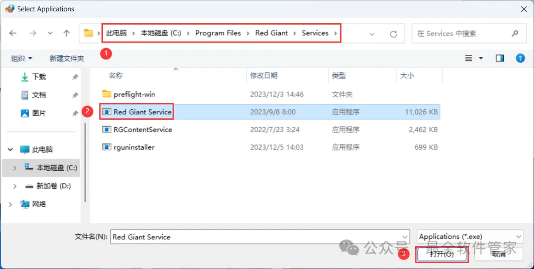 31、选择路径C:\Program Files\ Red Giant\ Service下的【Red Giant Service】程序,再点击【打开】