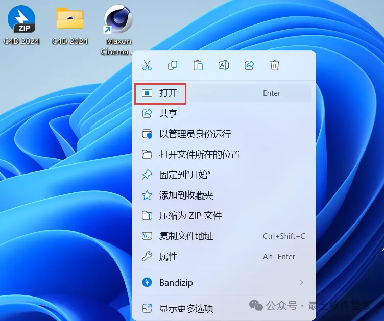 33、回到桌面,右键桌面上的【Maxon Cinema 4D 2024软件图标】,点击【打开】