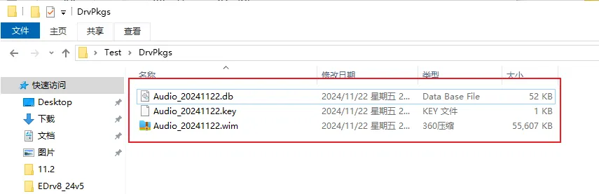 5. 驱动制作完成后,到输出目录DrvPkgs 这里查看,可以看到驱动包。每个驱动包有 db、key 和 wim 三个文件,增、删、移动请一起。