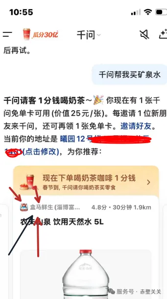 - 想换品类?喊 “千问帮我买鸡蛋”“千问帮我买矿泉水”,会自动跳转超市界面~