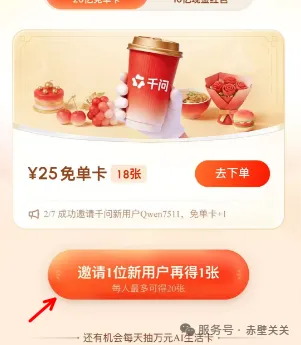阿里千问 AI 重磅推出「春节 30 亿免单计划」,每个账号最高可享 21 次 25 元无门槛补贴,累计到手 525 元(21 次 ×25 元)!这是千问 AI 为普及 AI 生活方式送出的诚意福利,能兑换奶茶、鸡蛋、矿泉水等各类商品,相当于白嫖一堆好物~ 活动上线 4 小时就狂销 200 万单,9 小时订单破 1000 万,不管是都市年轻人还是县域长辈,都在跟风解锁 AI 消费新体验!