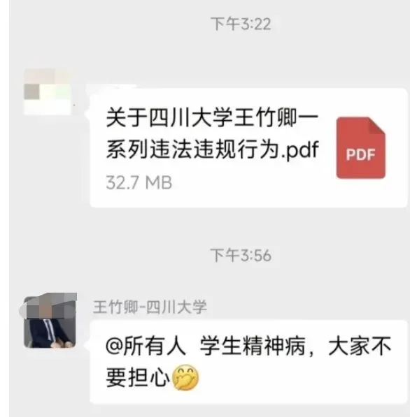 有意思的是,在群里,举报人发完材料后,当时导师十几分钟后就@了所有人,他说:学生是精神病,大家不要担心。