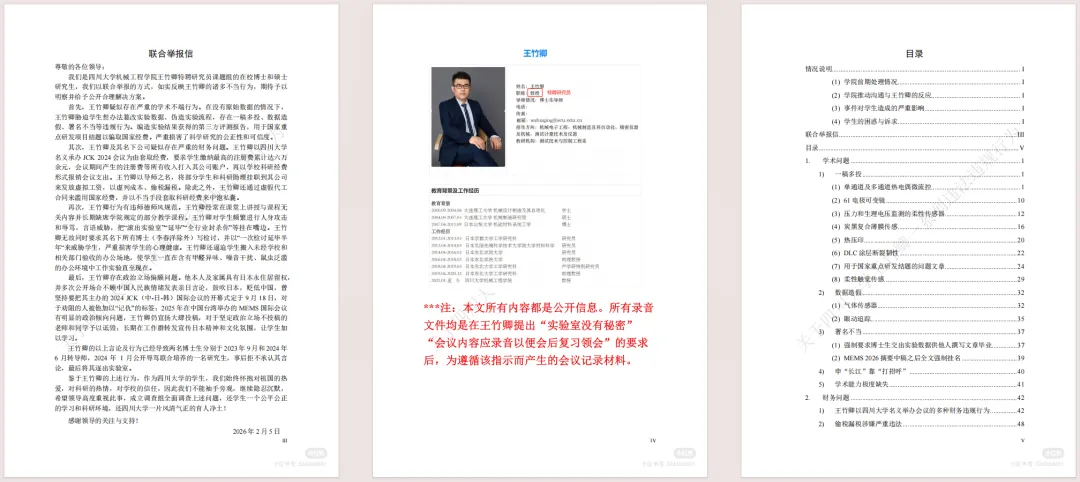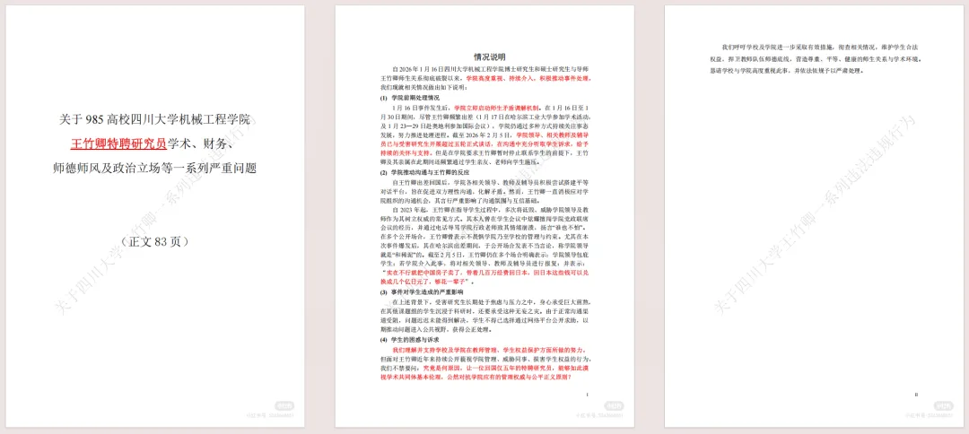 2026年2月5日,四川大学机械工程学院特聘研究员王竹卿遭课题组硕博研究生联合举报,一份83页举报信揭露其学术不端、财务违规、师德失范及政治立场偏颇等多重严重问题,2026年1月16日师生关系彻底破裂后,学院虽介入调解并与学生开展多轮谈话,但王竹卿消极应对且通过亲属施压,甚至威胁学院人员、扬言“卖中国房产携科研经费赴日”,学生无奈公开求助。