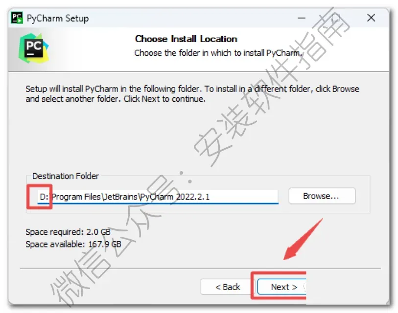 4、选择软件安装路径,建议和教程中的保持一致,本例安装到D盘路径地址中的首字符C改为D表示安装到D盘,安装路径不要出现中文点击“Next