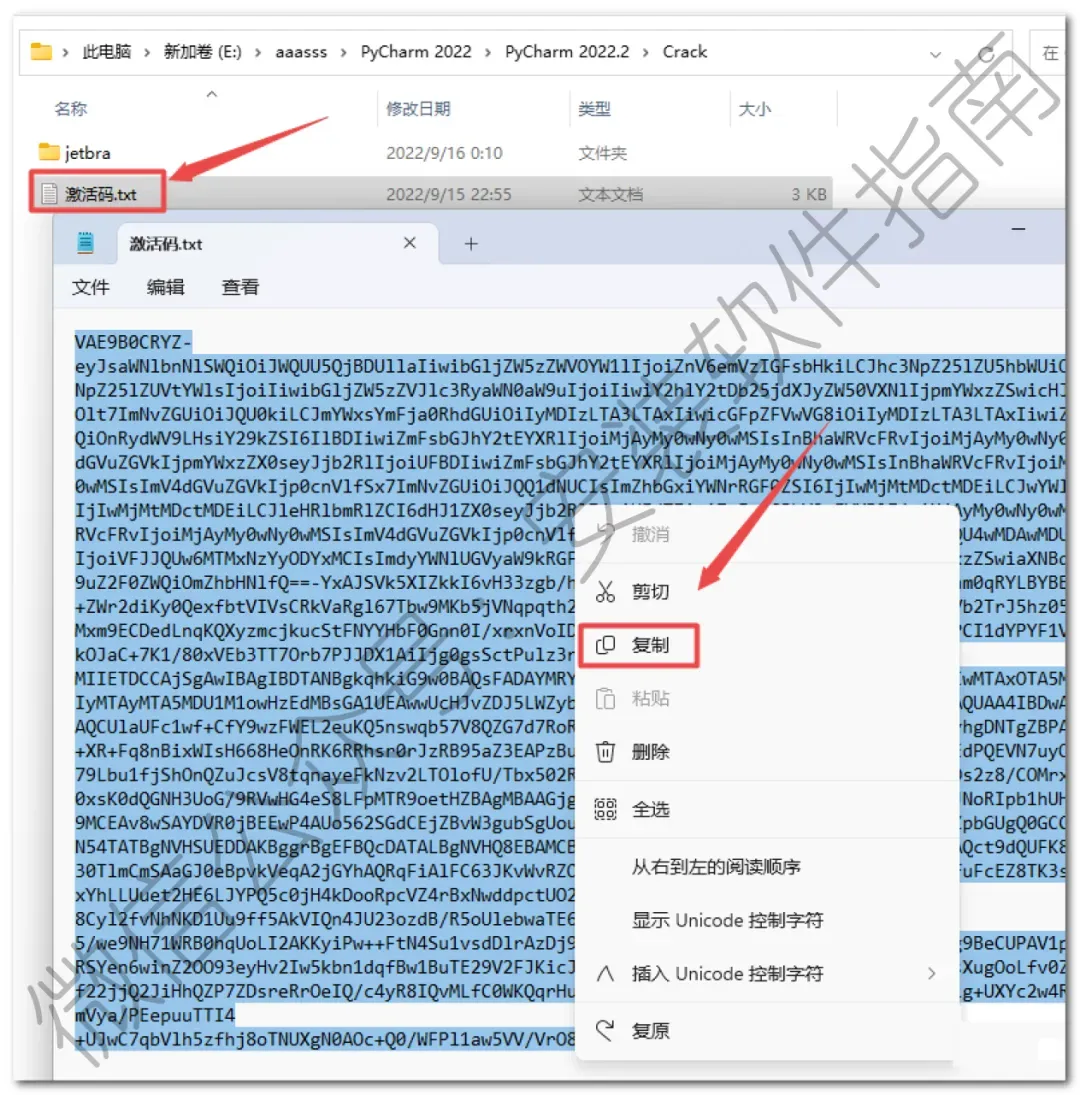 17、返回之前解压的“PyCharm 2022.2”文件夹,双击打开“Crack”文件夹,再打开”激活码“文件,全部选中打开文本中的激活码,鼠标右键点击“复制”