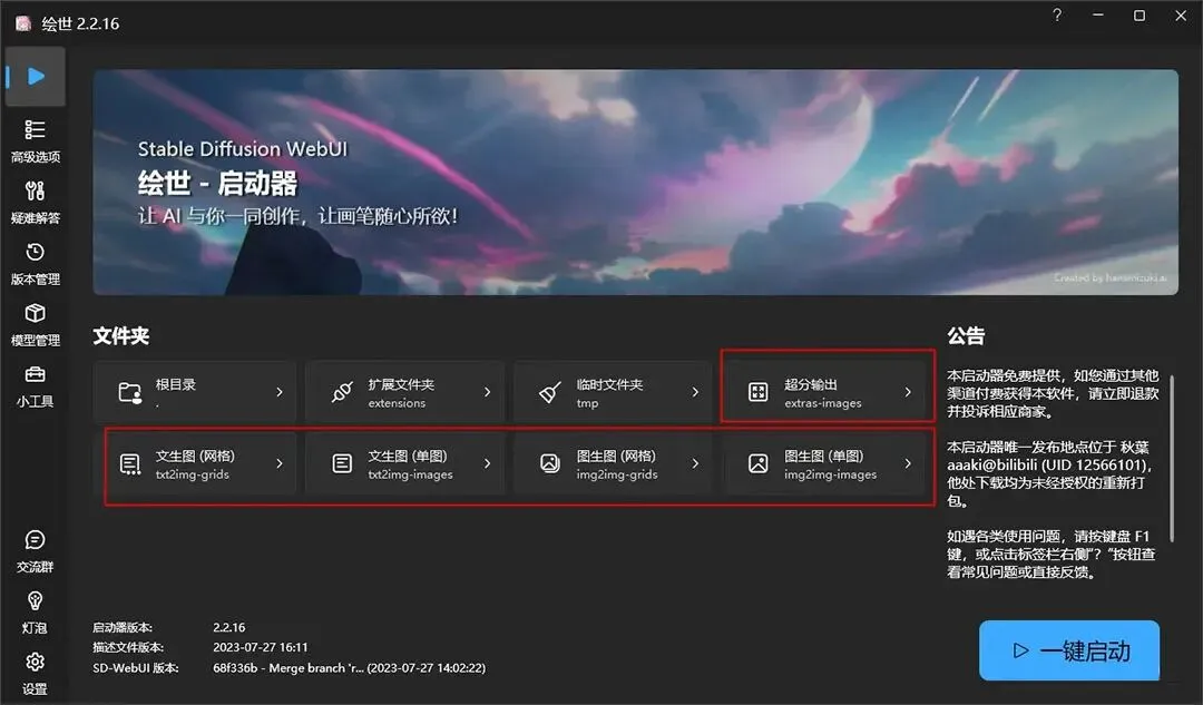 除了在这个WebUl上直接下载图片,我们还可以通过启动工具下载,如下图所示,红框圈出的就是各种生成方式保存图片的位置,单击就可以打开本机目录。