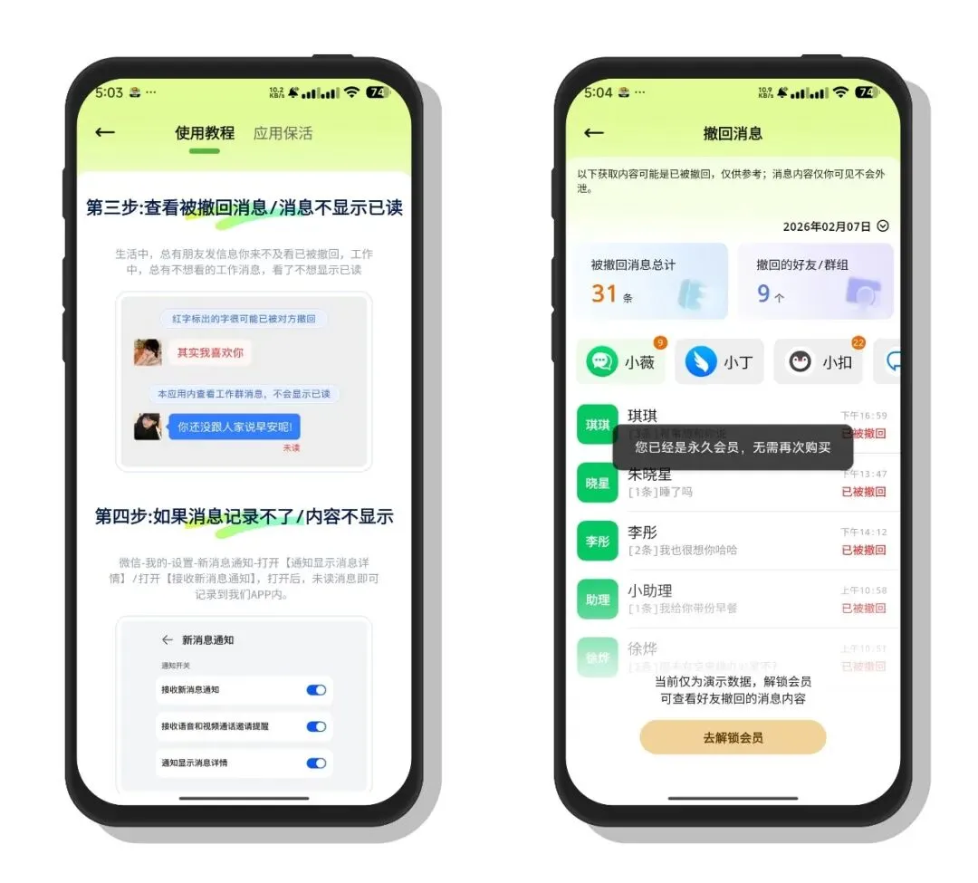 这款软件支持多平台防消息撤回,可轻松查看消息不必急着回复,对方撤回的内容也能显示。它能有效保护用户隐私,还能把特别关心的人设为弹幕滚动通知。值得一提的是,今天提供的是会员版本,里面的功能小伙伴们都能尽情使用。