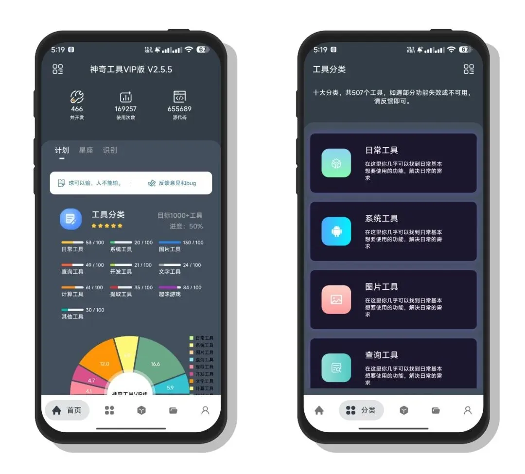 今天这款神奇工具是一个汇集了超多功能的手机工具,该软件目前已经有了500多个工具,包括日常、图片、文字。查询、系统等多种工具,开发者的目标是1000款工具,现在还在继续更新中。
