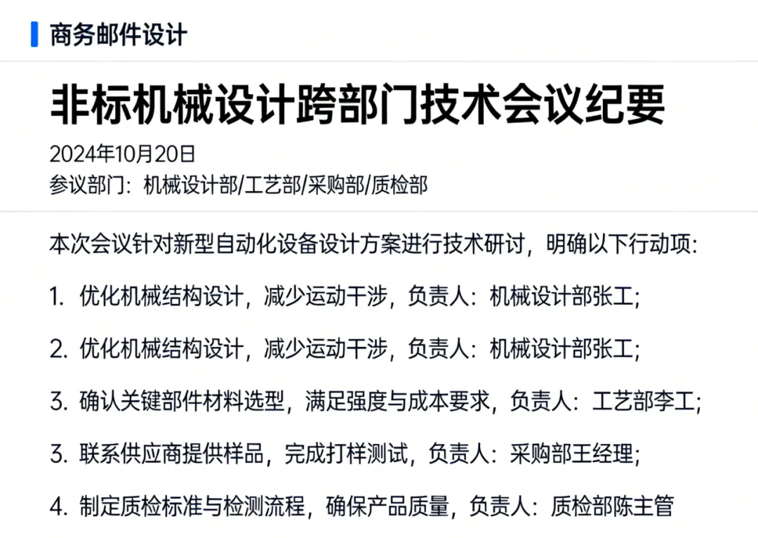 邮件沟通规范化: 工作沟通尽量使用邮件,标题明确(如【请审阅】XX设备传动方案-V1.2),正文条理清晰,需要对方行动的事项用列表列出。