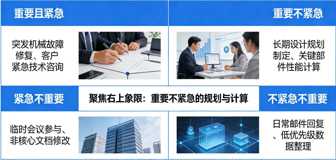 然后使用 艾森豪威尔矩阵 区分任务的“重要-紧急”程度,优先处理“重要不紧急”的任务(如关键结构计算),防止其演变为“重要又紧急”的危机。