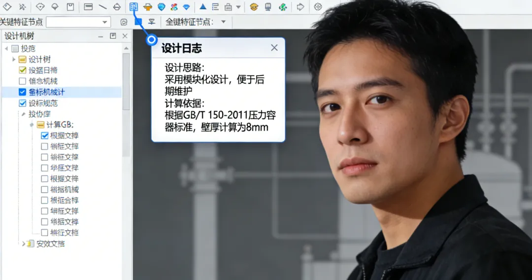 设计过程文档化: 在SOLIDWORKS中,使用 “设计日志” 功能,在特征树里直接记录关键尺寸的决策依据。
