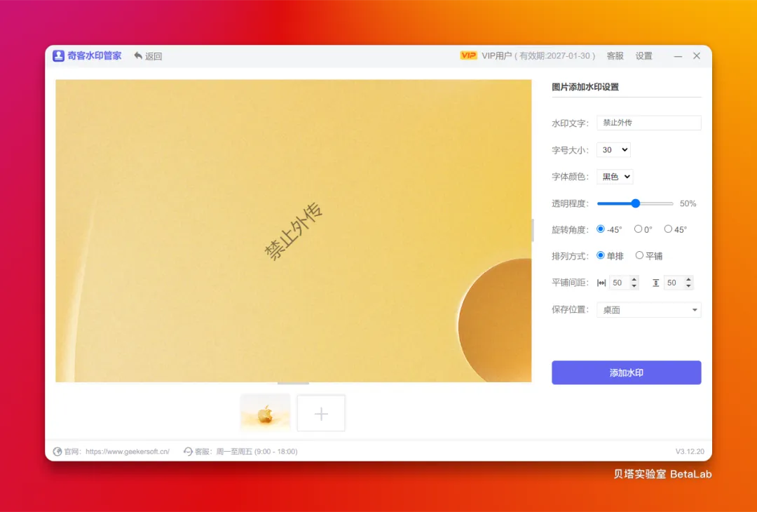 添加的水印支持自定义文字内容,可以调整字号大小、字体颜色、水印的透明度和旋转角度等,还支持两种排列方式,分别是单排和平铺。