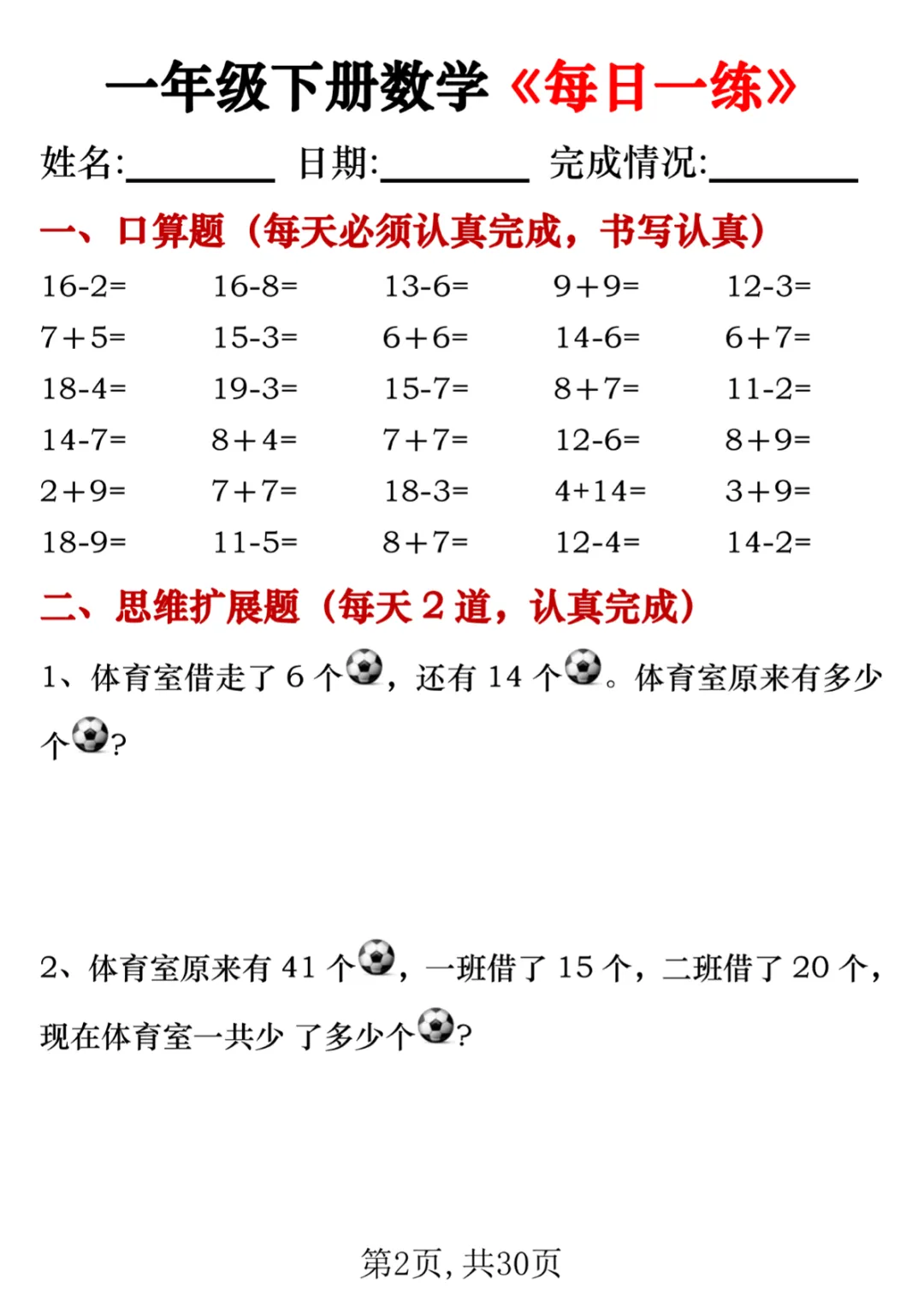 【免费下载】一年级(下)数学 每日一练专项,PDF电子版,可打印