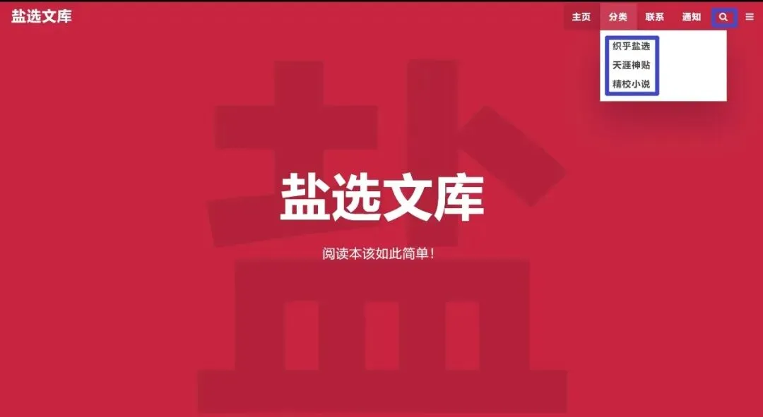 作为盐选免费找文平台,它的资源分类细到离谱:知乎小说、专栏、高赞回答合集全都有,还支持全文检索,每天同步更新热门内容。想精准定位某类盐选内容?冲它就对了
