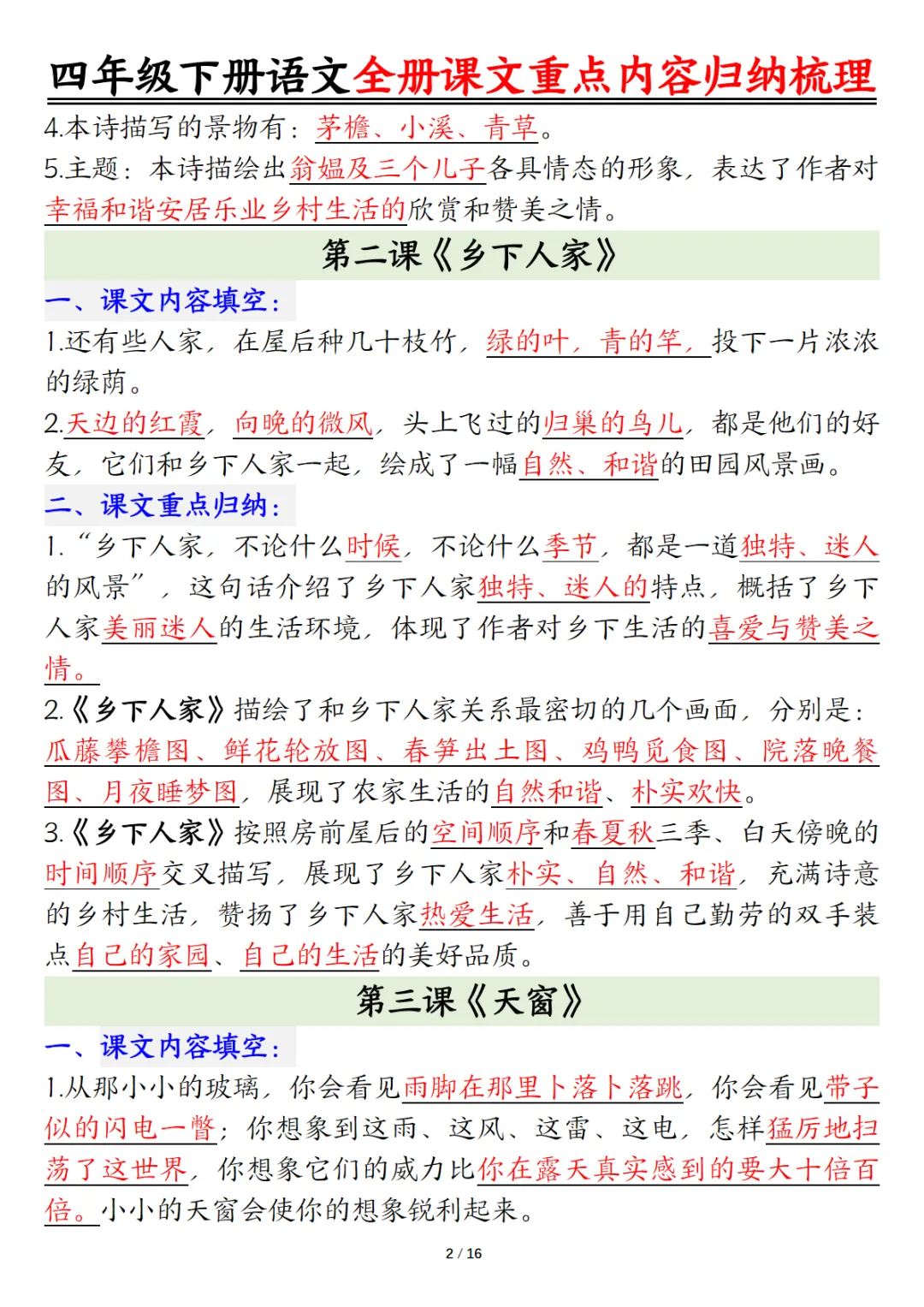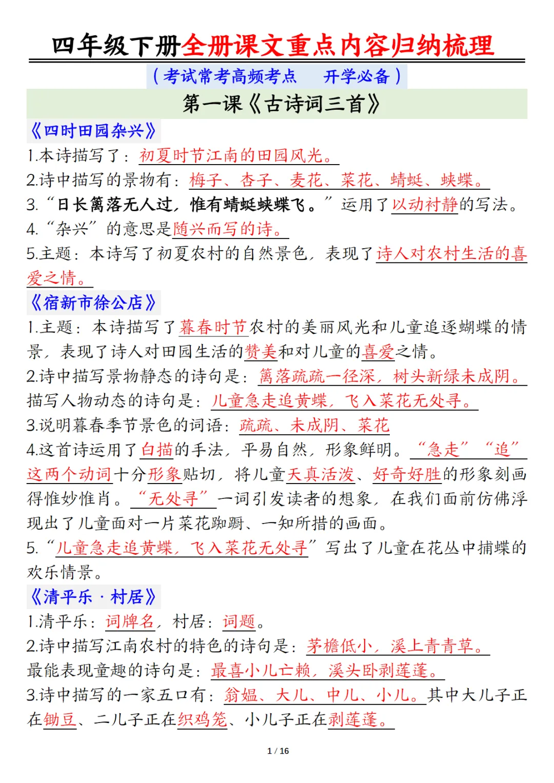【免费下载】四年级(下)语文 总复习课文重点知识点归纳汇总,PDF电子版,可打印
