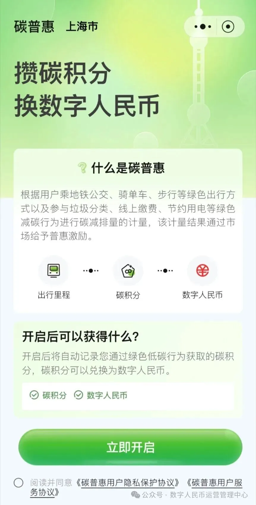 为丰富数字人民币在“绿色金融”场景的运用,数字人民币运营管理中心协调并支持业务运营机构构建碳普惠领域的创新应用场景,在数字人民币App内推出“碳普惠”小程序服务并率先在上海地区上线。