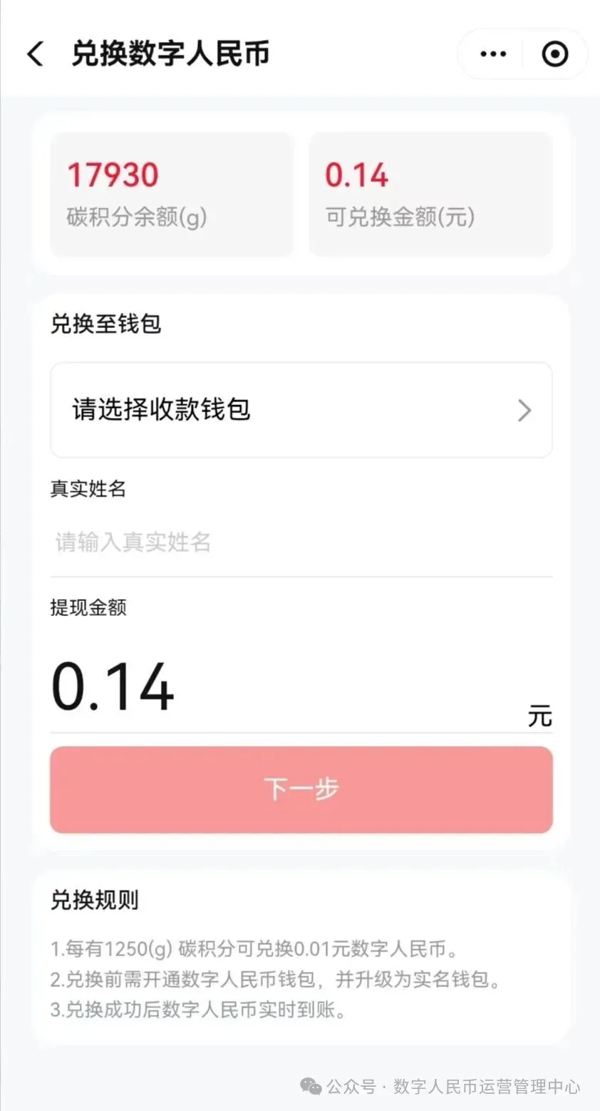 碳积分可兑换数字人民币,兑换前需开通数字人民币钱包,并升级为实名钱包,兑换成功后数字人民币实时到账。